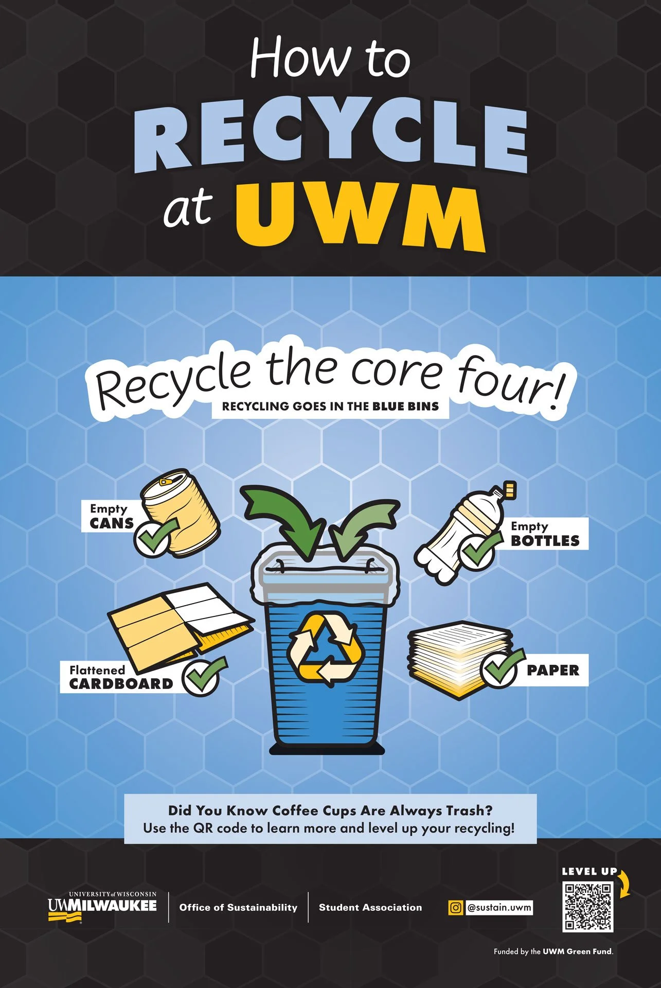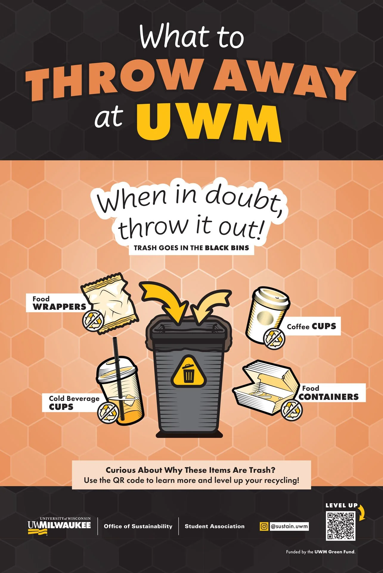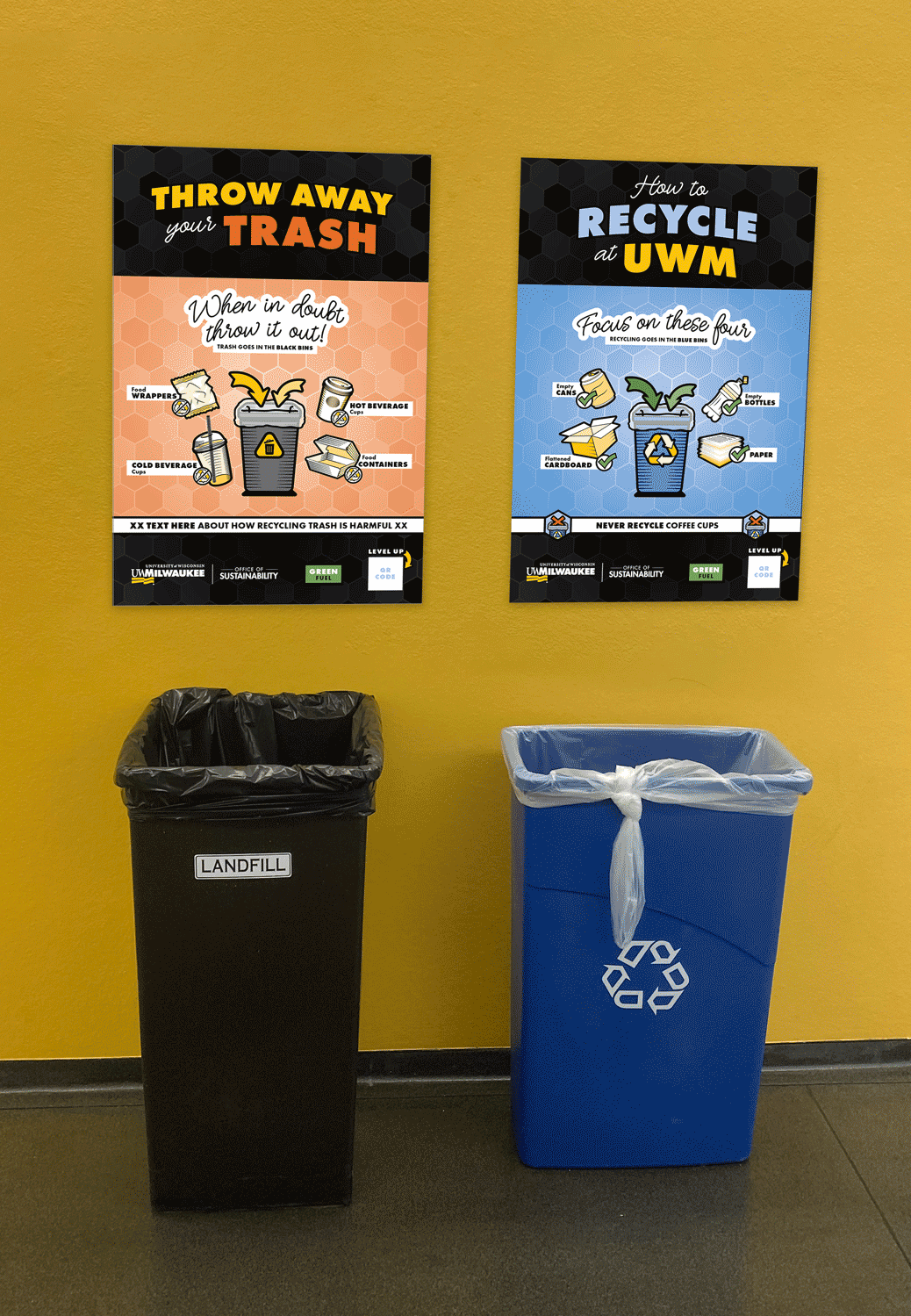 The UWM campus community needed some guidance concerning recycling. The Office of Sustainability tasked me with creating eye-catching and clearly communicating signage to be hung over waste bins and inform folks about common sorting issues. In addition to the signs, my clients requested a suite of icons and graphics that they can use to elevate their social media posts. I had a lot of fun building out these signs, sourcing and expanding the icon sets for them, and refreshing their look and feel with new assets.